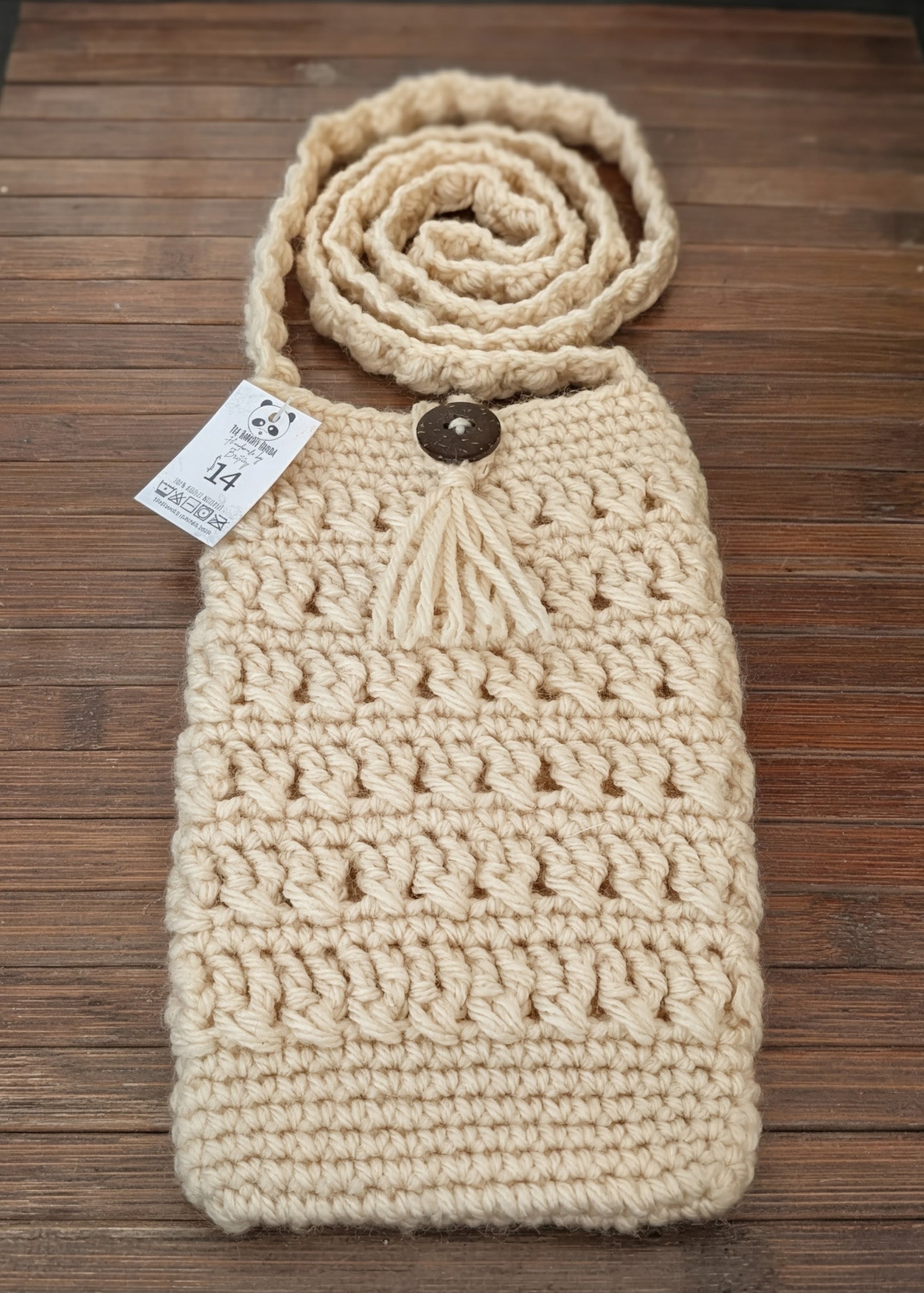 Meet your new best friend for concerts, errands, or just surviving a day when your outfit has zero pockets. This compact crossbody bag holds the goods (phone, cards, emergency candy) while keeping your hands totally free for important things, like holding coffee or dramatic gesturing. Hand-crocheted with a delightful texture and finished with a stylish wooden button and tassel accent-it's 100% functional and 200% adorable. Big bag energy, tiny bag package.