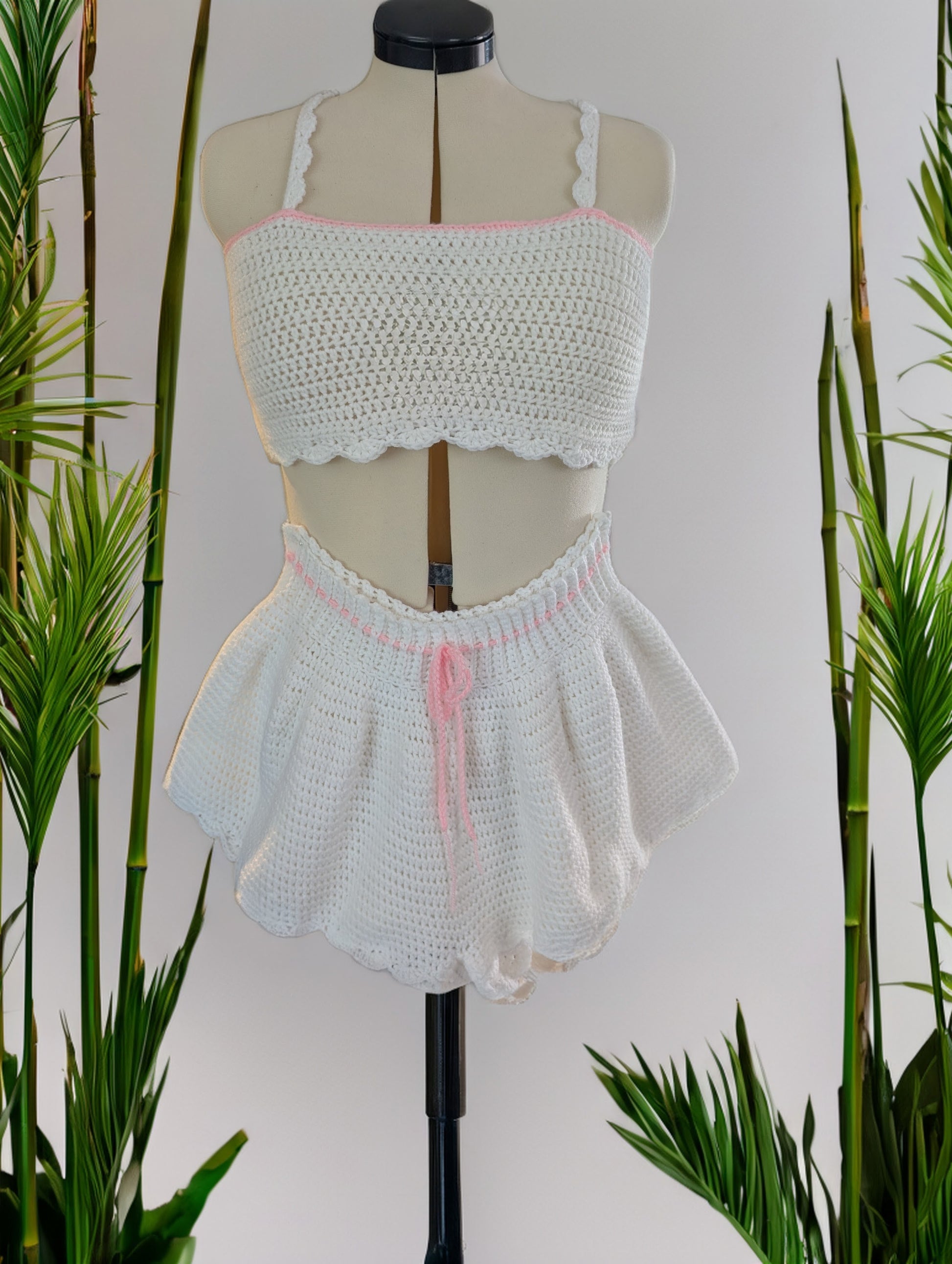 •Sweet Details: The set includes a cropped top and matching frilly shorts. Note the charming scalloped edges on the top and the flirty, feminine skirt-like flair of the shorts.